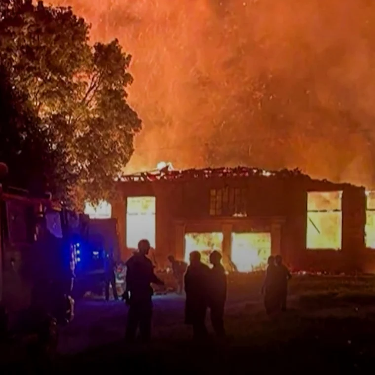 In a separate post on his own Telegram channel, regional Gov. Oleh Syniehubov said initial reports suggested two men had died and another four were injured in the “large scale fire.”