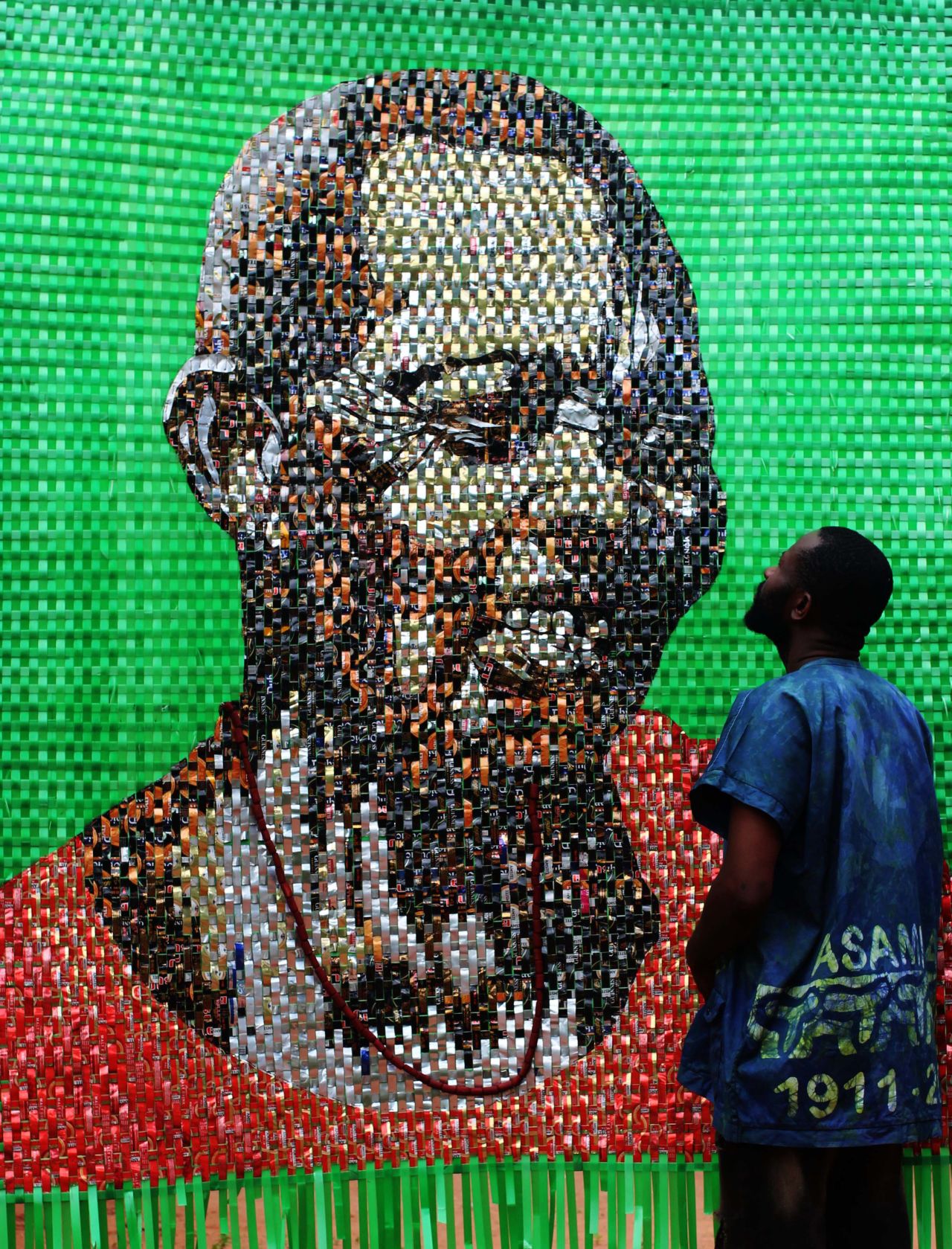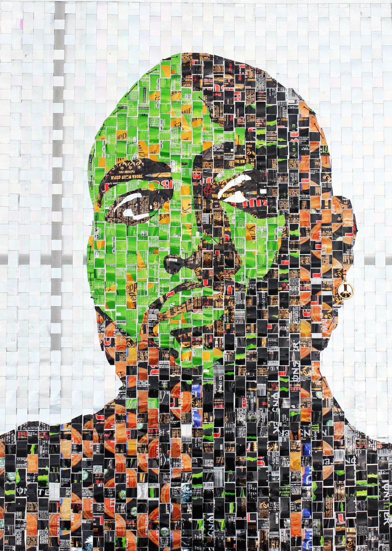 Next, he interlocks the colorful outer part of the cans into the plain part of the canvas to create portraits. It’s a technique inspired by both fabric and mat weaving, or “nka-ute” in Ifedilichukwu’s Igbo dialect. Each piece takes him up to two weeks to complete.