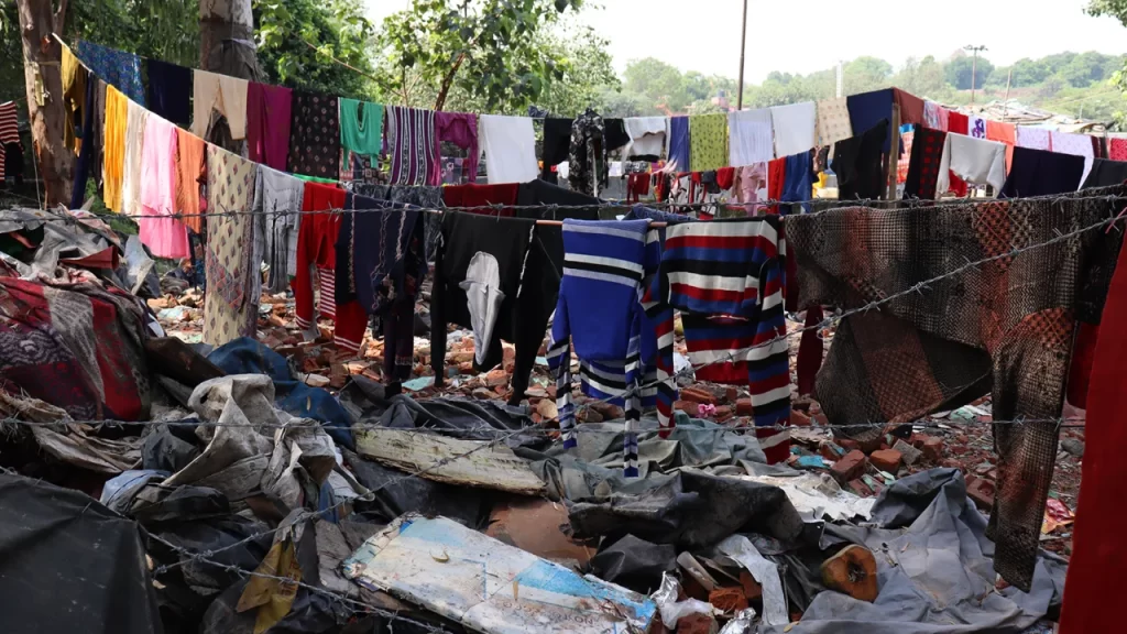More than 100,000 residents living in the Tughlaqabad area lost their homes in April, according to a Supreme Court petition filed by a lawyer assisting the residents. With nowhere to go and no money to rent an apartment, many including Savita’s family had no choice but to live under tarpaulin sheets on the rugged land, even as torrential rains and floods battered the city.