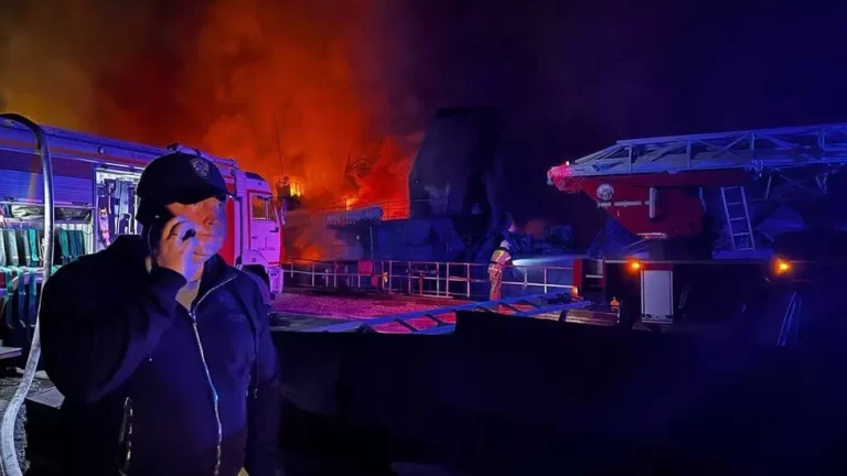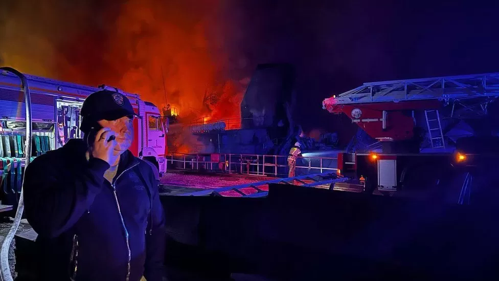 Russia said two of its ships were damaged as a result of hits by cruise missiles. A photo shared by Mr Razvozhayev on Telegram shows flames engulfing what appears to be a vessel at a port as he stands speaking into his phone.
