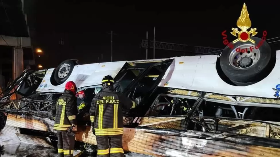 The bus broke through a barrier and plunged near railway tracks in the district of Mestre, which is connected to Venice by a bridge. Among the dead are five Ukrainians, one German and the Italian driver, city prefect Michele Di Bari said.