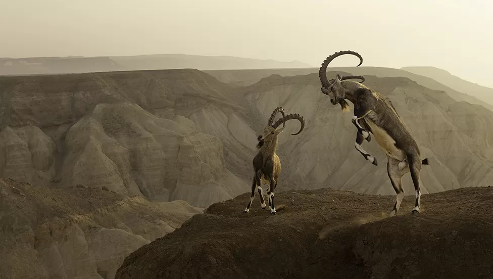 Amit Eshel witnessed this tussle between two male Nubian ibexes in Israel's Zin Desert. The battle lasted about 15 minutes before one surrendered and the pair parted without serious injury. Eshel's photograph won the Animals in their Environment category.