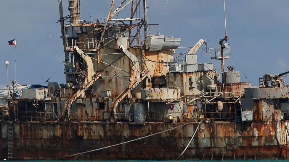 It was deliberately grounded on the reef in 1999. Since then, a tiny contingent of Philippine marines has kept lonely watch aboard the rusting hulk as it has gradually begun to fall apart. In 2014 a BBC team went aboard the ship. Even then it was in terrible condition with huge holes in its sides, and waves splashing through the structure.
