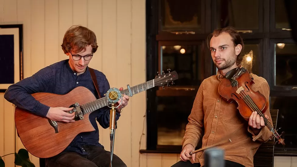 The guitar player said the 27-year-olds had discovered “how little stuff” they need to gig, each carrying a 15kg (33lb) bag. Seth, from Gloucestershire, said: “I've got kind of a medium-sized backpack and using an elaborate system of carabiners, my fiddle is strapped to the back of a bag, and I've also got the mic.