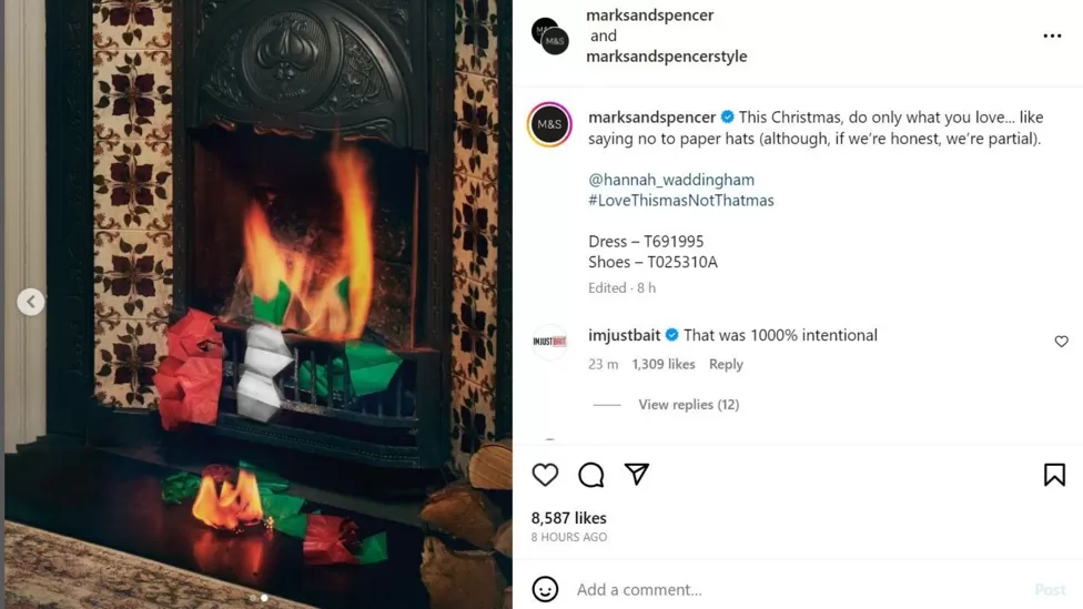 The image, an out-take from one of the company's TV adverts, showed red, green and silver hats burning in a fireplace. M&S said the intent was to “playfully show that some people don't enjoy wearing paper Christmas hats”.
