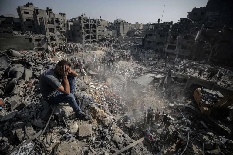 The massive second strike on Jabalya created further catastrophic damage, destroying several buildings in the Falluja neighborhood of the camp, with video from the site showing a deep crater and people digging through the rubble searching for bodies.