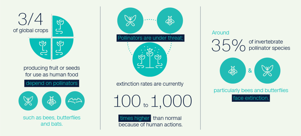 Pollinators include bumblebees, wasps, moths and butterflies, as well as birds and small mammals, like bats. But many are facing threats from pesticides and crop monocultures, as well as the destruction of their habitats.