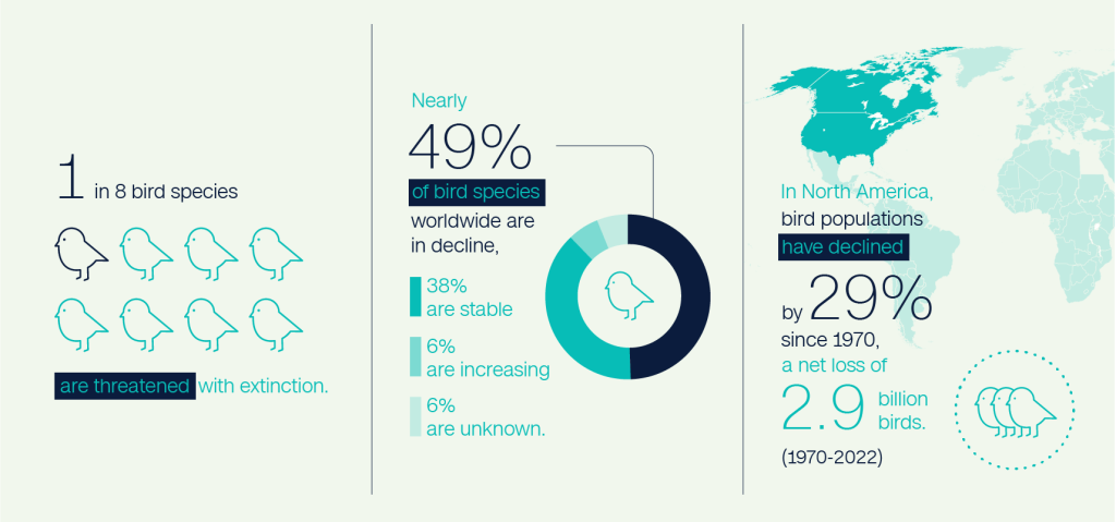 In 50 years, nearly 3 billion birds have disappeared from North America’s skies and the UK has 73 million fewer birds than it had in 1970, according to research from the British Trust for Ornithology. In Hawaii, 33 bird species have gone extinct since 1825 due to habitat loss and the introduction of mammals and disease, while in India, 178 species of wild bird are of high conservation priority.