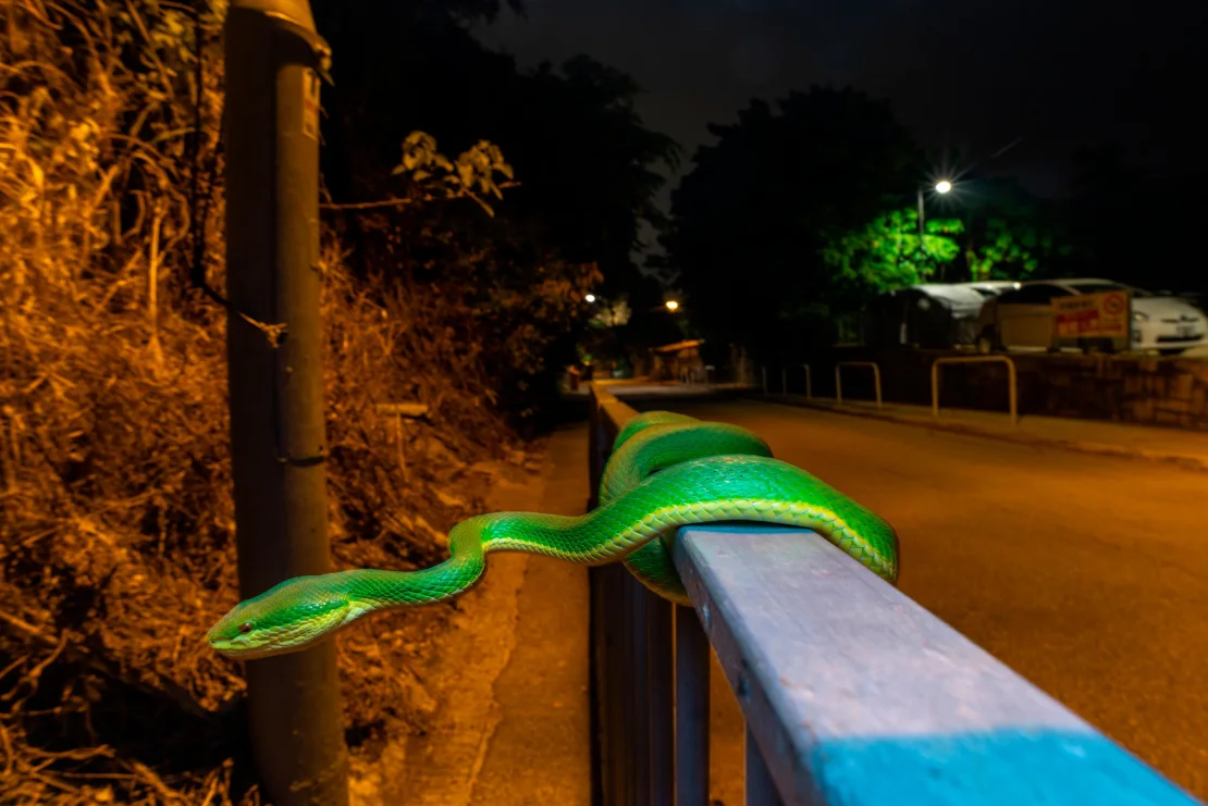 A green pit viper coiled around a drainpipe, three blue-banded bees sleeping on a grass blade, and a gecko climbing a tree against the backdrop of a bustling city. They’re all part of Hong Kong-British wildlife photographer Lawrence Hylton’s extensive portfolio.