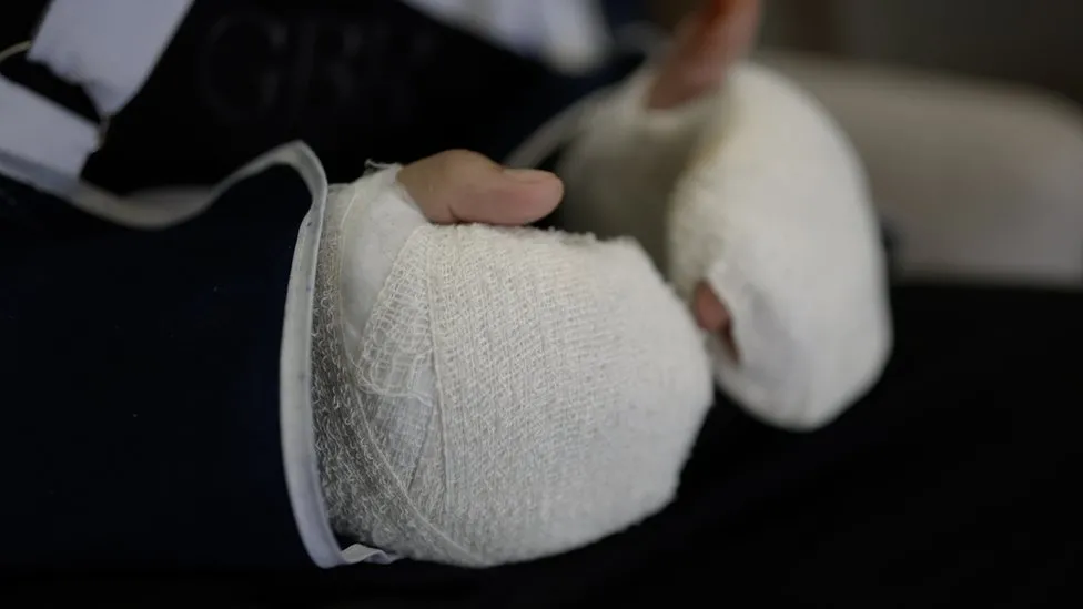 In the footage, the teenager's hands are unbandaged, and appear to be hanging by his sides – including as he climbs onto the bus – but are out of shot for most of the video. Mohammed told us that the first medical treatment he received was on that Red Cross bus.