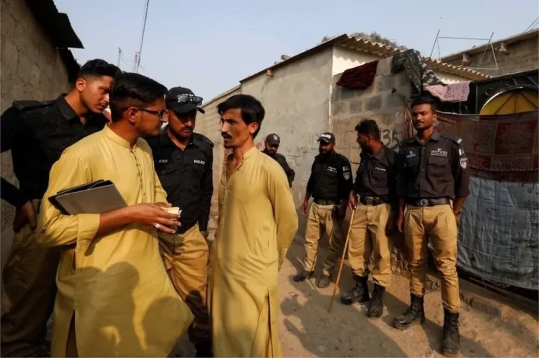 Across the yard, Pakistani police are outside a property, looking for undocumented foreigners. The officers flip through papers as several men sit expectantly inside.