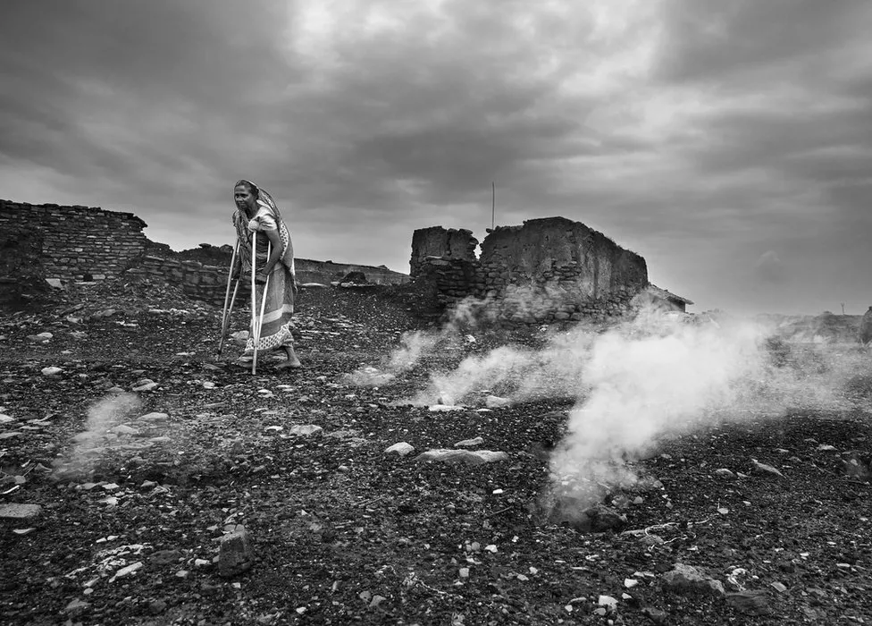In the image above, a Dalit (formerly known as untouchable) woman worker limps past an open-cast coal mine in India's Jharkhand state, where underground fires have burned for over a century.