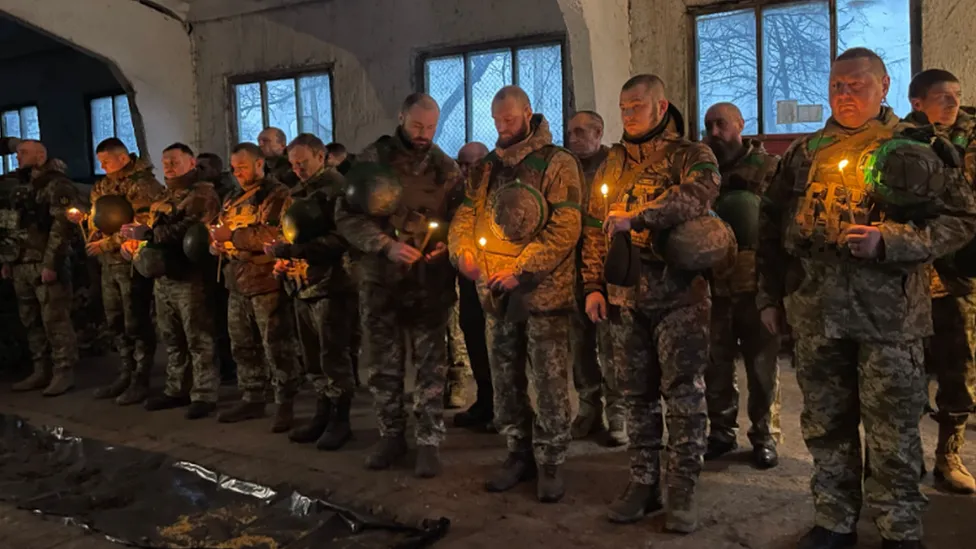 With Russian drones constantly loitering above, large gatherings are dangerous. In a barn near Kupiansk, around 15 soldiers find the briefest of pauses for a Christmas prayer.