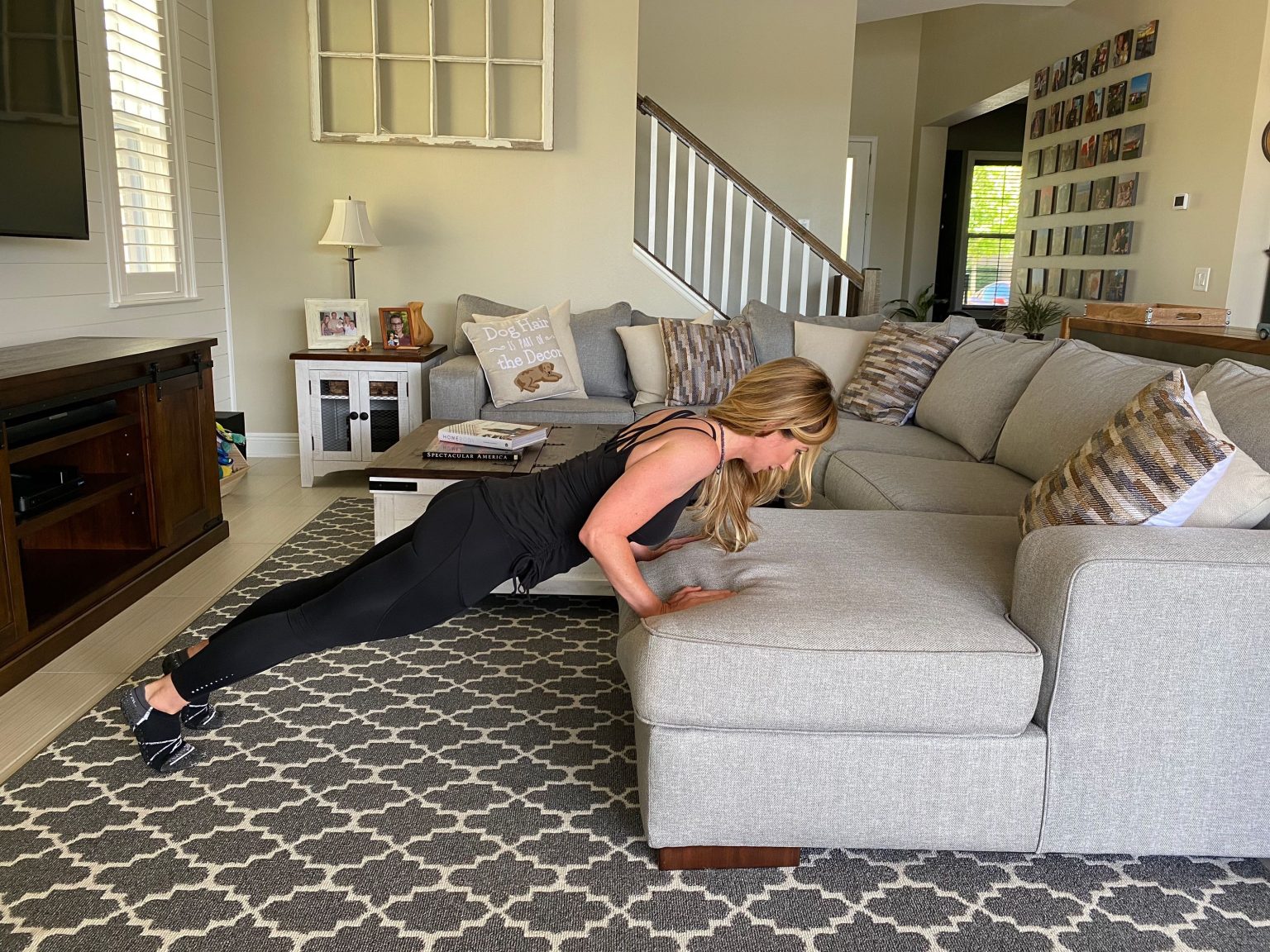 With your hands aligned directly under your shoulders, keep your core tight and your back straight as you inhale and bend your arms to lower yourself toward the couch. Exhale as you straighten your arms and lift your body back to your starting plank position without arching your back or neck. That’s one push-up. Continue for eight to 10 repetitions or however many you can do comfortably with good form.