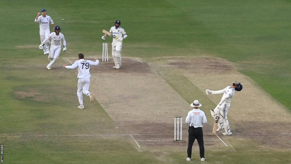 The extra time was allowed, the shadows closed in. Ashwin danced past Hartley to be stumped, but still India were not beaten. Jasprit Bumrah and Mohammed Siraj swiped 25 for the final wicket before Siraj was stumped off Hartley to spark wild England celebrations.
