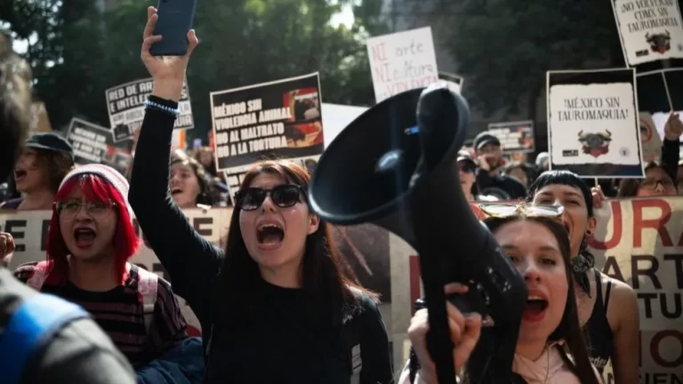 “Torture is not art, it is not culture,” demonstrators shouted near the Plaza de México bullring, the largest bullfighting arena in the world. People waved banners with slogans, including “no more deaths of innocents”. Others wore bull masks and painted themselves in red.