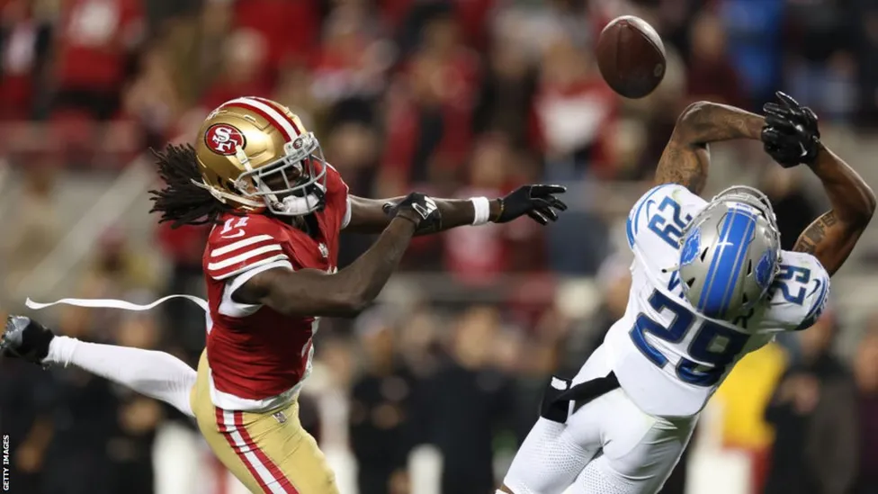 A San Francisco field goal cut the deficit to 24-10 before a stunning catch by Brandon Aiyuk gave the 49ers hope. Both he and Detroit's Kindle Vildor jumped for a deep pass just yards from the end zone and the ball bounced off Vildor's hand and facemask before Aiyuk stayed alert to make an acrobatic grab.