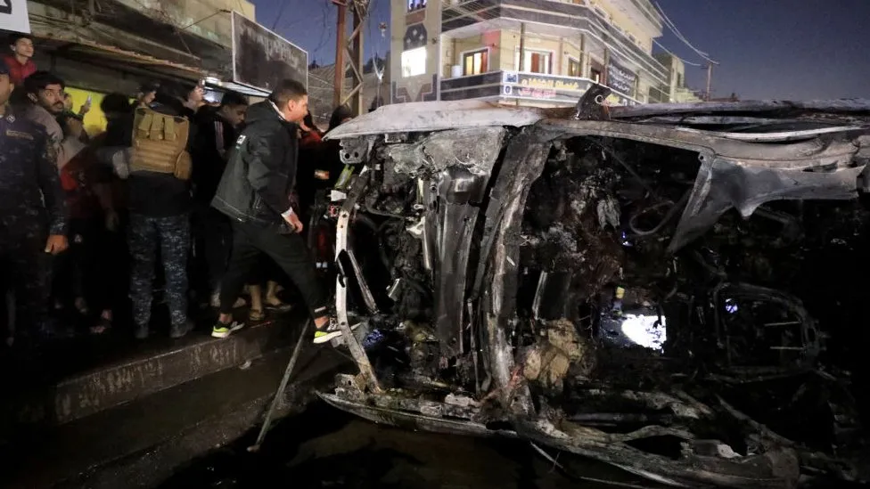 Wednesday night's drone raid happened in Baghdad's Mashtal neighbourhood, sparking several loud explosions. It was a precise strike on a moving vehicle in a busy street and the car was reduced to a fiery wreck.