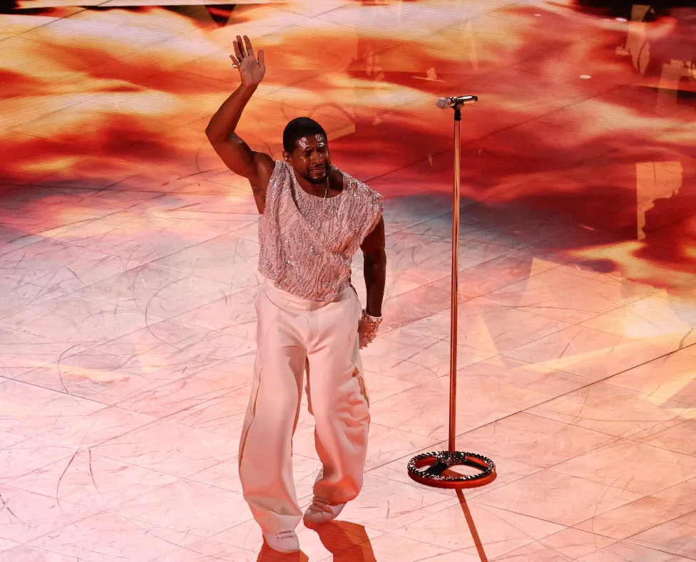 A disclaimer shown before the performance jokingly warned viewers it may cause “singing, dancing, sweating, gyrating, and possible relationship issues”. It would go on to deliver on all fronts. Dressed in all-white and surrounded by a swarm of energetic dancers, Usher emerged on the stage at the Allegiant Stadium in Las Vegas and launched straight into one of his best-known songs, Caught Up.