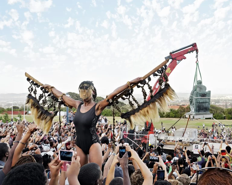 Nine years ago, Sethembile Msezane stepped on top of a plinth, wearing a black body suit and stiletto heels, her arms adorned with wings she fashioned out of wood, velvet, and hair. Behind her, a statue of a man can be seen being lifted in the air. “Chapungu — The Day Rhodes Fell” has since become an iconic photograph, capturing the spirit of the #RhodesMustFall movement which led to the removal of 19th century colonist Cecil Rhodes’ statue at the University of Cape Town.
