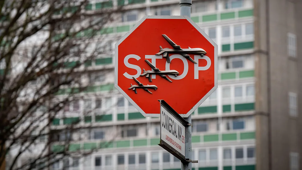 A stop sign that had been adapted by Banksy was removed an hour after it appeared in Peckham, South London, on 22 December 2023. Two men were arrested on suspicion of theft and criminal damage in relation to the sign, which was decorated with three military drones and could be worth up to £500,000.