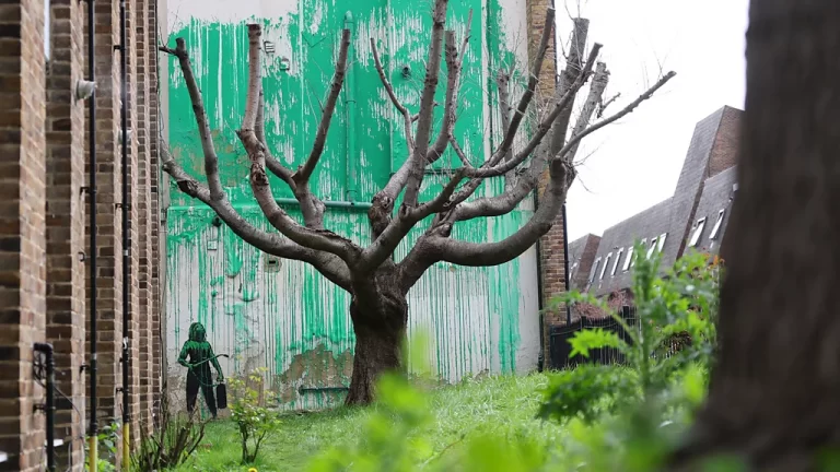 Banksy – who hasn't revealed his identity, but is one of the world's most famous artists – yesterday confirmed he was the creator of a mural that popped up on Sunday in Finsbury Park, Islington. Behind a bare cherry tree next to a block of flats, a wall has been sprayed with green paint.