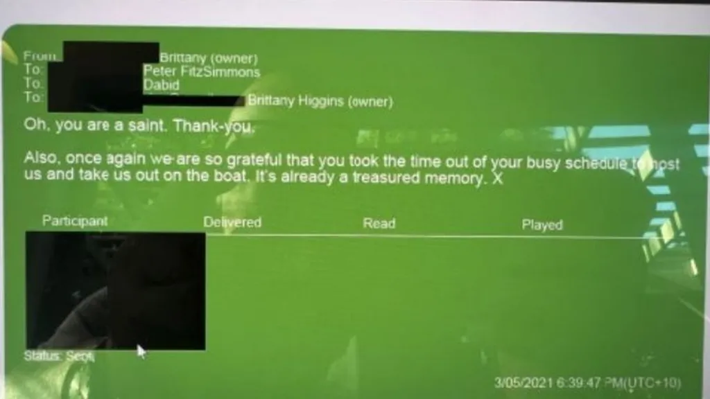 And as proof that documents were exchanged, Mr Auerbach cited images taken of a laptop screen showing some of Ms Higgins' texts. In the reflection of the laptop screen, there appears to be a bald man with thick black glasses – which Mr Auerbach says is Mark Llewellyn, Spotlight's executive producer. The metadata of the photo shows it was taken at Mr Lehrmann's accommodation at the time, Mr Auerbach claimed.