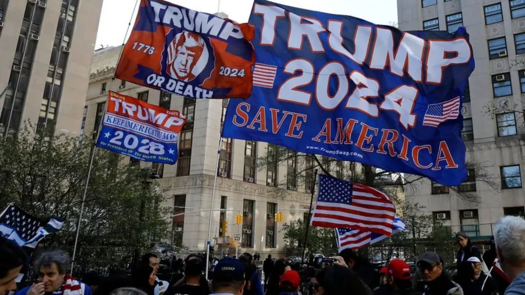 Throughout the day, Mr Trump was cheered on by dozens of people who rallied peacefully but loudly outside court. They included a man playing The Star-Spangled Banner on the flute for hours and a Trump impersonator wearing a blond wig and red tie.