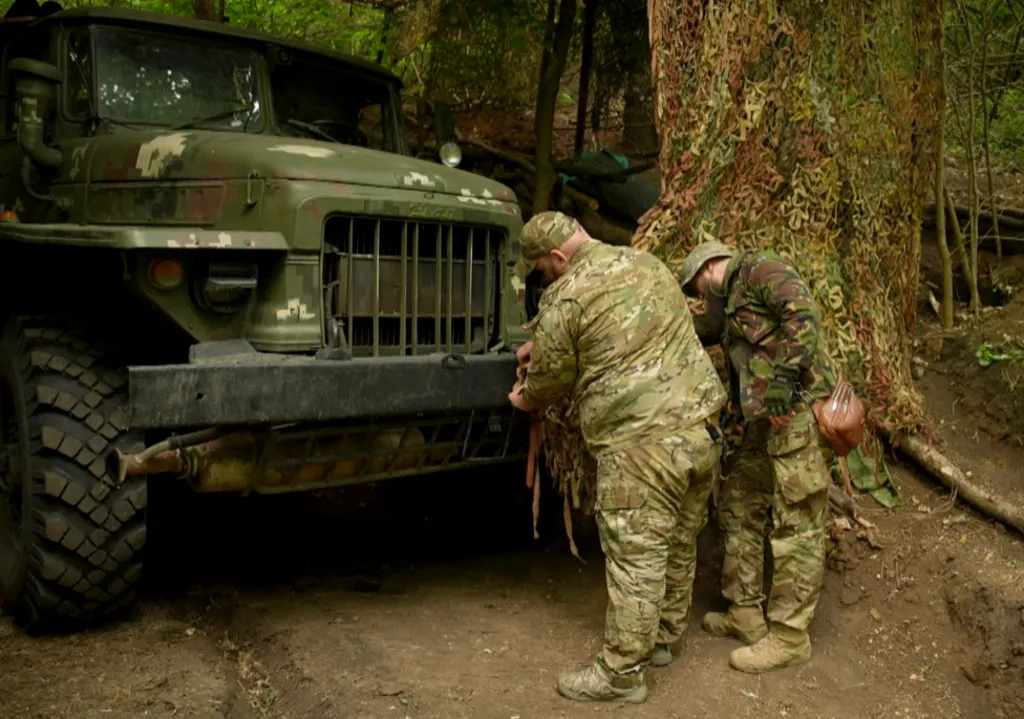 Under the rich, leafy cover of the Ukrainian spring, an artillery unit awaits.
