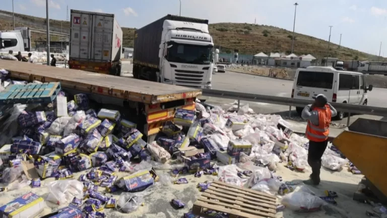 Israeli protesters blocked aid trucks destined for Gaza on Monday, throwing food packages onto the road and ripping bags of grain open in the occupied West Bank. The lorries, which were set upon at the Tarqumiya checkpoint west of Hebron, came from Jordan and were headed to the Gaza Strip, where tens of thousands of Palestinians face food and aid shortages.