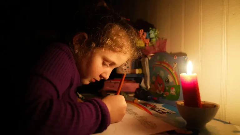 But when evening falls over her home, the lights don’t come on anymore. Russia has been targeting the power supply. So Angelina lights a candle, carefully, her small figure casting a giant shadow on the wall of their flat. “It happens all the time,” she shrugs, about the blackouts.
