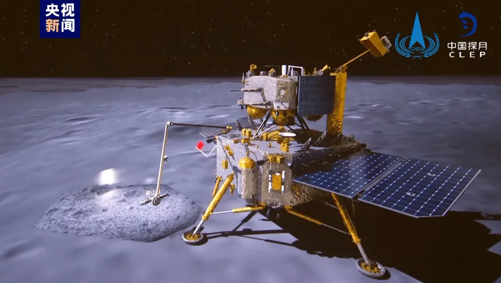 China's mission aims to be the first to bring back rock and soil samples from the region, which scientists say could be very different from rock formations on the moon's near side. State media published videos from China's space agency showing the unmanned robot craft sticking out a little arm and waving the Chinese flag after it collected the precious samples.