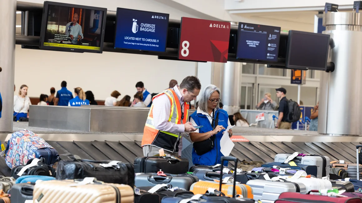 At Atlanta’s Hartsfield-Jackson International Airport, Delta’s headquarters and largest hub, thousands of pieces of luggage are lined up on the floors of baggage claim. The bags made it to the world’s busiest airport but, through delays and cancellations, their owners either have not yet arrived or arrived on a different plane.